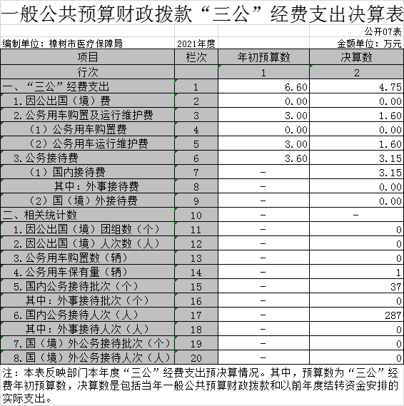三、“三公”經(jīng)費(fèi):指用一般公共預(yù)算財(cái)政撥款安排的因公出國(境)費(fèi)、公務(wù)用車購置及運(yùn)行維護(hù)費(fèi)和公務(wù)接待費(fèi)。其中,因公出國(境)費(fèi)反映單位公務(wù)出國(境)的國際旅費(fèi)、國外城市間交通費(fèi)、住宿費(fèi)、伙食費(fèi)、培訓(xùn)費(fèi)、公雜費(fèi)等支出;公務(wù)用車購置及運(yùn)行維護(hù)費(fèi)反映單位公務(wù)用車車輛購置支出(含車輛購置稅、牌照費(fèi)),按規(guī)定保留的公務(wù)用車燃料費(fèi)、維修費(fèi)、過橋過路費(fèi)、保險(xiǎn)費(fèi)、安全獎(jiǎng)勵(lì)費(fèi)用等支出;公務(wù)接待費(fèi)反映單位按規(guī)定開支的各類公務(wù)接待(含外賓接待)支出。