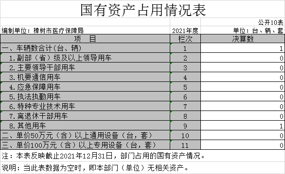 截止2021年12月31日,本部門(單位)國有資產(chǎn)占用情況見公開10表《國有資產(chǎn)占用情況表》。其中車輛中的其他用車主要是保留一輛公務(wù)用車用于對定點(diǎn)醫(yī)療機(jī)構(gòu)進(jìn)行醫(yī)保基金監(jiān)管稽查使用。