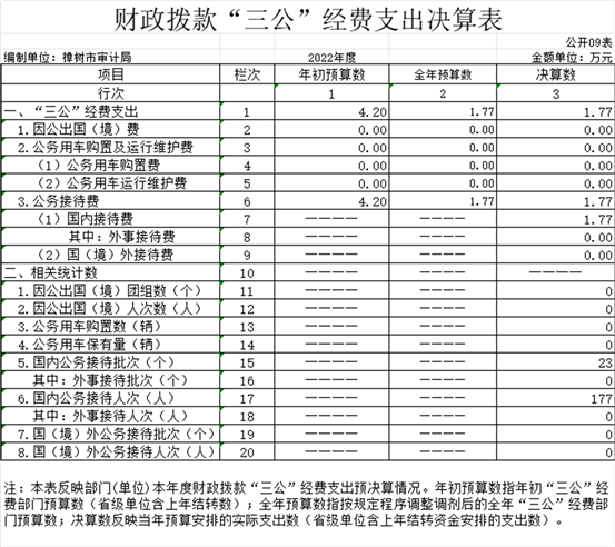“三公”經費支出:指用財政撥款安排的因公出國(境)費、公務用車購置及運行維護費和公務接待費。其中,因公出國(境)費反映單位公務出國(境)的國際旅費、國外城市間交通費、住宿費、伙食費、培訓費、公雜費等支出;公務用車購置及運行維護費反映單位公務用車車輛購置支出(含車輛購置稅、牌照費),按規定保留的公務用車燃料費、維修費、過橋過路費、保險費、安全獎勵費用等支出;公務接待費反映單位按規定開支的各類公務接待(含外賓接待)支出。