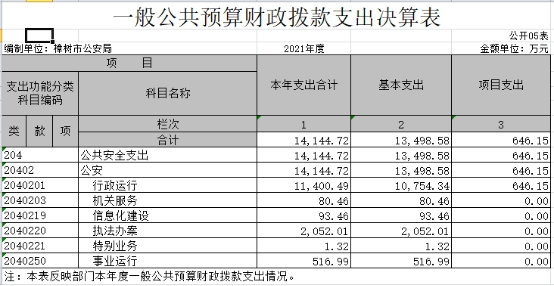 十三、公共安全支出(類)公安(款)行政運行(項):指公安局的基本支出,主要用于在職人員的工資保險等。