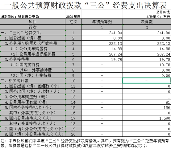 (三)公務用車購置及運行維護費支出222.12 萬元,其中公務用車購置年初預算數為14.88 萬元,決算數為14.88 萬元,完成預算的100 %,決算數較2020年減少67 萬元,下降81.83 %。公務用車運行維護費支出年初預算數為207.24 萬元,決算數為207.24萬元,完成預算的 100%,決算數較2020年減少36.89萬元,減少15.11 %,減少原因為:較上年度,提高了街面步巡警力,巡邏使用警車減少;其中公務用車購置年初預算數為14.88萬元,決算數為14.88萬元,全年購置公務用車1輛;2021年度公車保有量81輛(其中執法執勤用車68輛,特種專業技術用車13輛)。