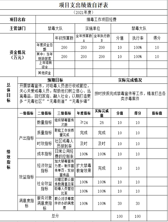 經綜合考評,2021年緝毒工作經費專項資金績效評價組評價為100分,總體績效評價為:優秀。