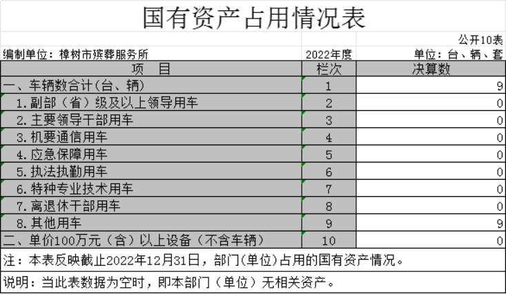 截止2022年12月31日,本單位國(guó)有資產(chǎn)占用情況見(jiàn)公開(kāi)10表《國(guó)有資產(chǎn)占用情況表》。車(chē)輛保有量為9輛,其中車(chē)輛中的其他用車(chē)全部是殯葬業(yè)務(wù)專(zhuān)用車(chē)。