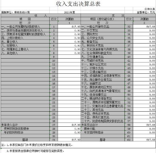 本部門2021年度收入總計817.09萬元,其中年初結轉和結余0萬元,較2020年增加176.12萬元,增長27.47%;本年收入合計817.09萬元,較2020年增加176.12萬元,增長27.47%,主要原因是:第七次人口普查“兩員”經費。