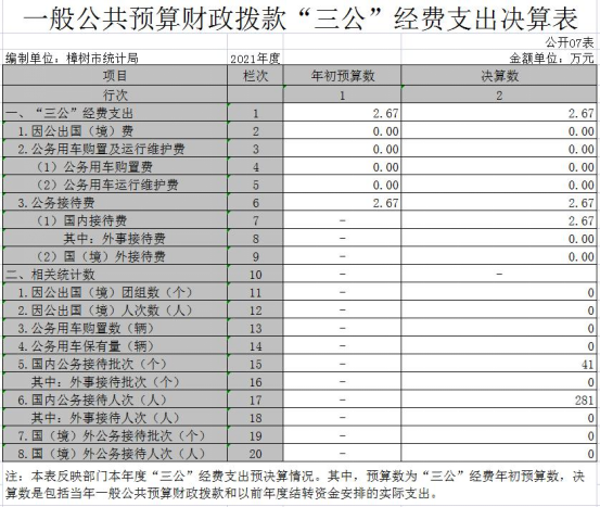 (二)公務接待費支出年初預算數為2.67萬元,決算數為2.67萬元,完成預算的100%,決算數較2020年增加0.87萬元,增長48.33%,主要原因是迎接省級和市級統計執法檢查。全年國內公務接待41批,累計接待281人次,其中外事接待0批,累計接待0人次。