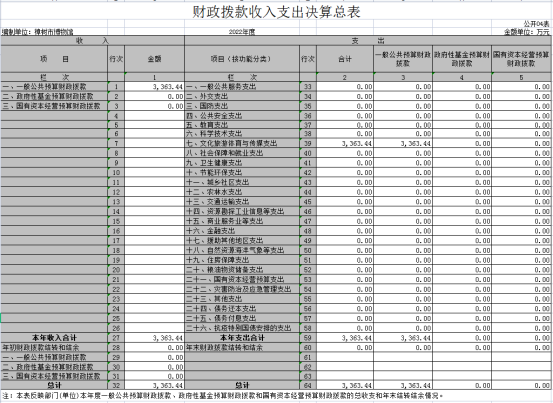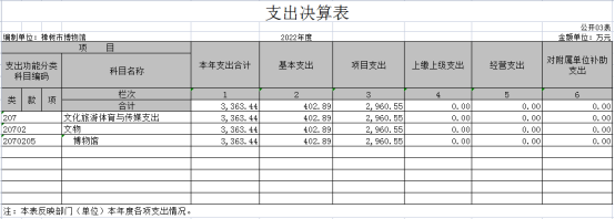 本單位2022年度支出總計 3363.44 萬元,其中本年支出合計 3363.44 萬元,較2021年增加 3042.91 萬元,增長949.3 %,主要原因是:工程建設(shè),新館陳展費用支出等;年末結(jié)轉(zhuǎn)和結(jié)余 0 萬元,較2021年增加(減少) 0 萬元,增長(下降) 0 %,主要原因是:2022年年末結(jié)轉(zhuǎn)結(jié)余為0,實行以支代收。