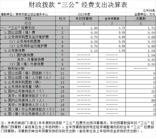 8、“三公”經費:納入財政預決算管理的“三公”經費,是指部門用財政撥款安排的因公出國(境)費、公務用車購置及運行費和公務接待費。其中,因公出國(境)費反映單位公務出國(境)的國際旅費、國外城市間交通費、住宿費、伙食費、培訓費、公雜費等支出;公務用車購置及運行費反映單位公務用車車輛購置支出(含車輛購置稅)及租用費、燃料費、維修費、過路過橋費、保險費、安全獎勵費用等支出;公務接待費反映單位按規定開支的各類公務接待(含外賓接待)支出。