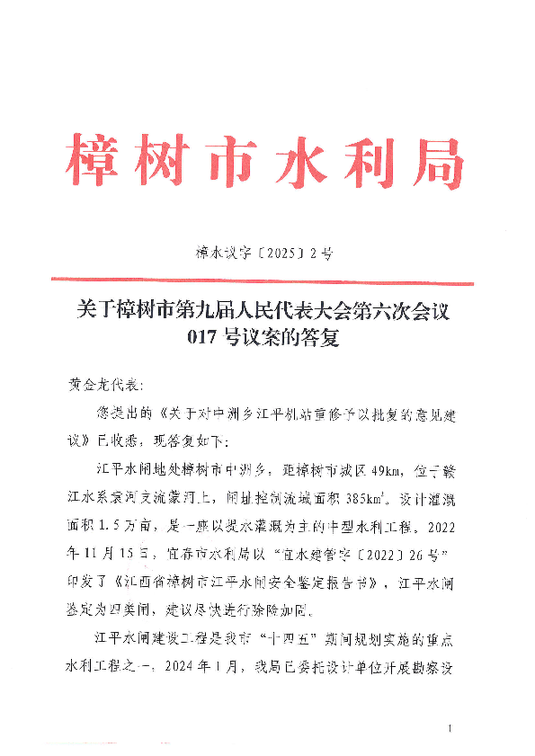 關(guān)于樟樹市第九屆人民代表大會(huì)第六次會(huì)議017 號(hào)議案的答復(fù)