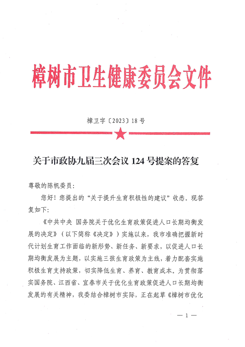 樟樹市衛健委關于市政協九屆三次會議124號提案的答復