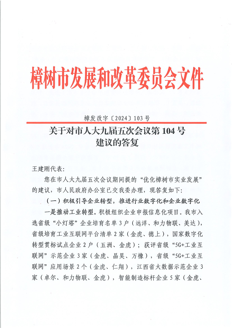 樟發改字〔2024〕103號:關于對市人大九屆五次會議第104號建議的答復