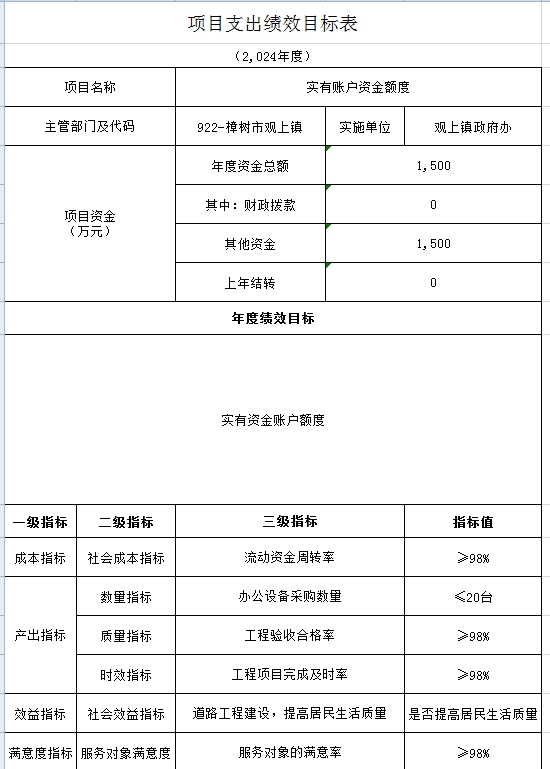 實有賬戶資金額度項目,立項依據為保障政府基本運轉,實施主體為樟樹市觀上鎮人民政府,實施周期為2024年度,年度預算安排1500萬元,績效目標為:保障政府基本運轉;指標:成本指標、產出指標、效益指標、滿意度指標。