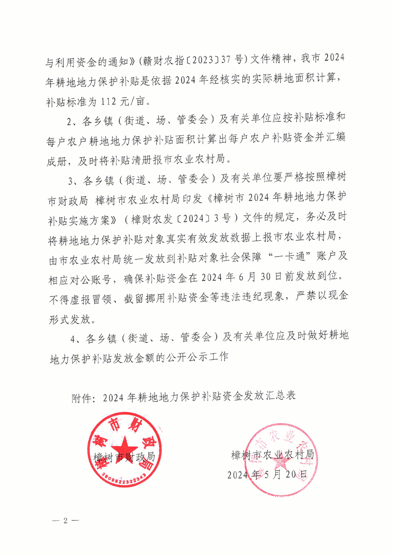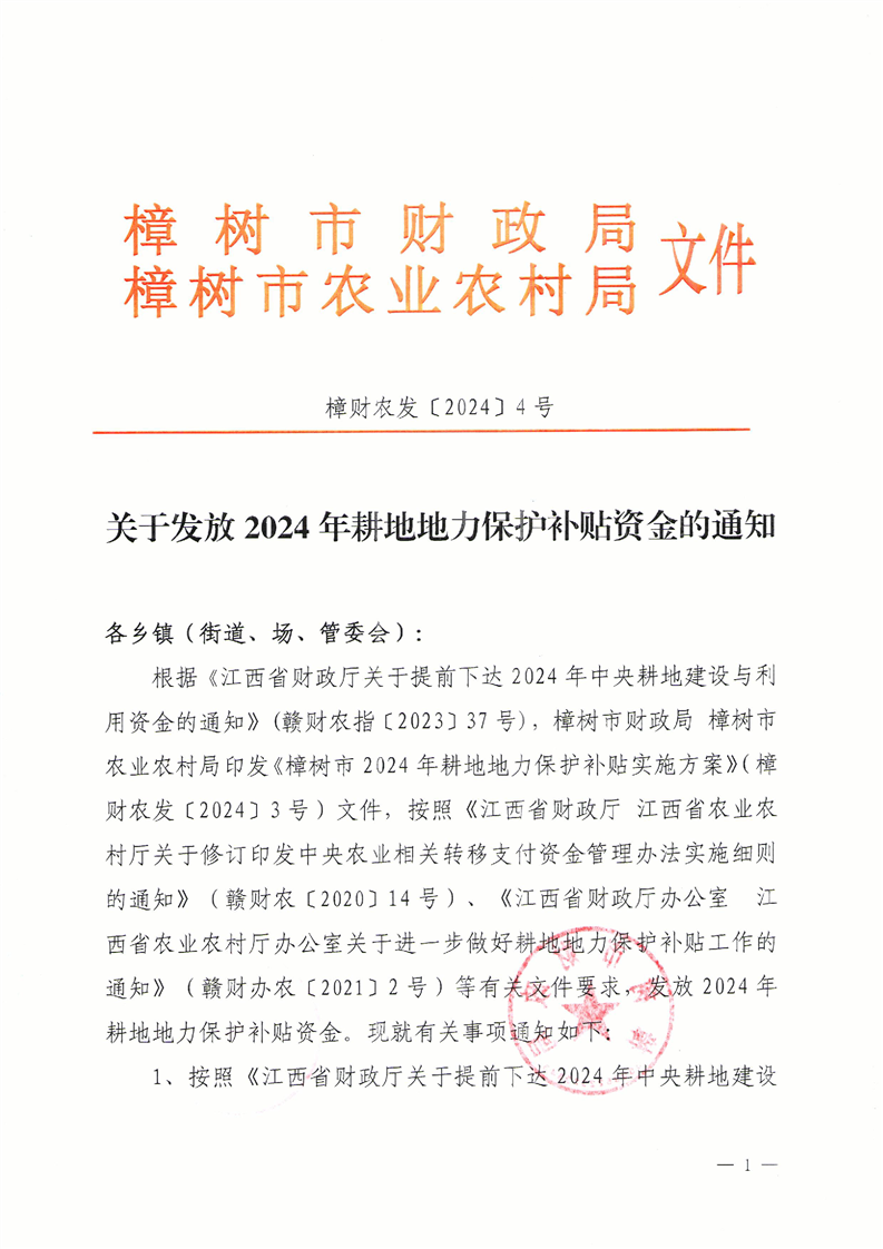 樟財(cái)農(nóng)發(fā)〔2024〕4號(hào)關(guān)于發(fā)放2024年耕地地力保護(hù)補(bǔ)貼資金的通知