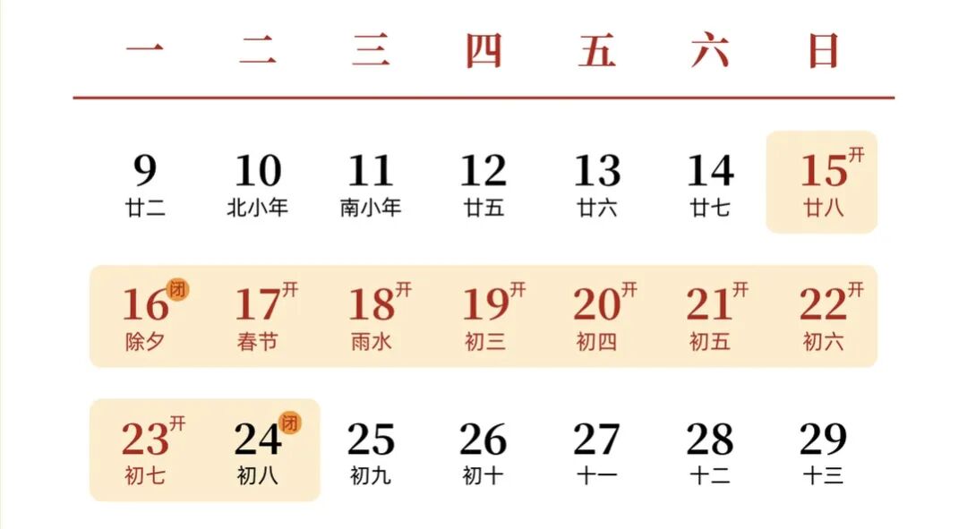 2月17日(初一)至2月23日(初七)正常開放
