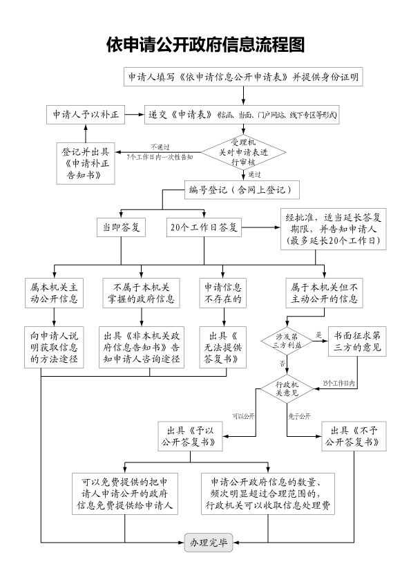 本機關收到政府信息公開申請后,對《申請表》的要件是否完備進行審查,對于要件完備,可以當場受理的,當場受理登記并出具《登記回執(zhí)》;政府信息公開申請內(nèi)容不明確的,行政機關應當給予指導和釋明,并自收到申請之日起7個工作日內(nèi)一次性告知申請人作出補正,說明需要補正的事項和合理的補正期限。