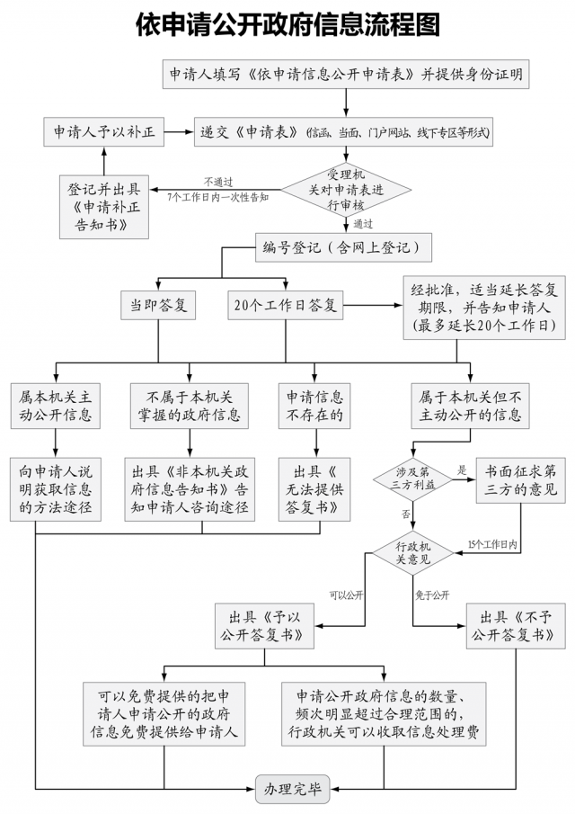 本機關(guān)收到政府信息公開申請后,按規(guī)定程序?qū)ι暾堖M行審查,能夠當場答復(fù)的,當場予以答復(fù);不能當場答復(fù)的,自收到申請之日起在20個工作日內(nèi)予以答復(fù);如遇特殊情況需延長答復(fù)期限的,經(jīng)本機關(guān)信息公開工作機構(gòu)負責人同意,并告知申請人,可延長20個工作日。