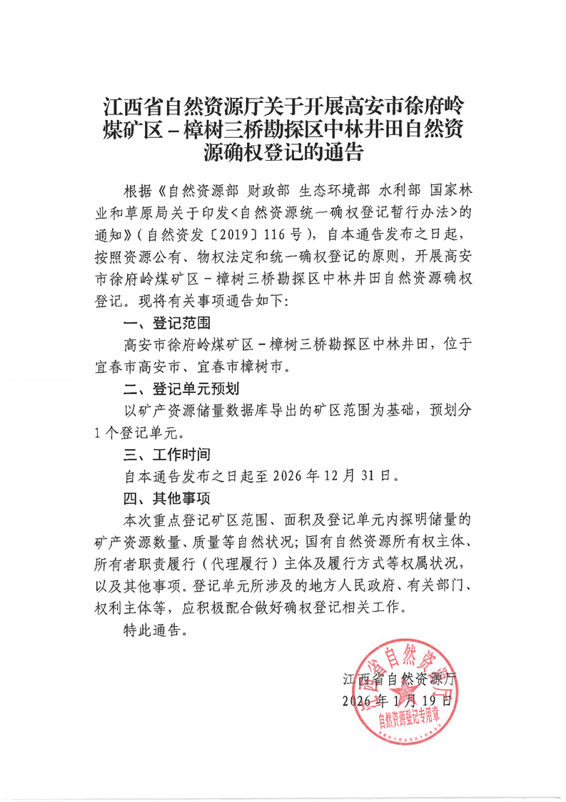 江西省自然資源廳關(guān)于開展高安市徐府嶺煤礦區(qū)-樟樹三橋勘探區(qū)中林井田自然資源確權(quán)登記的通告