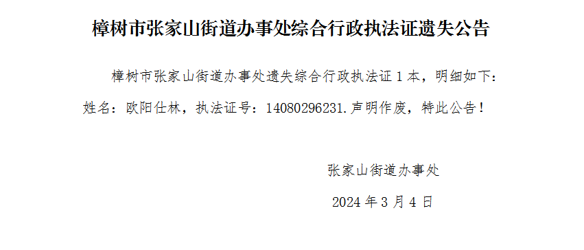 樟樹市張家山街道辦事處綜合行政執法證遺失公告