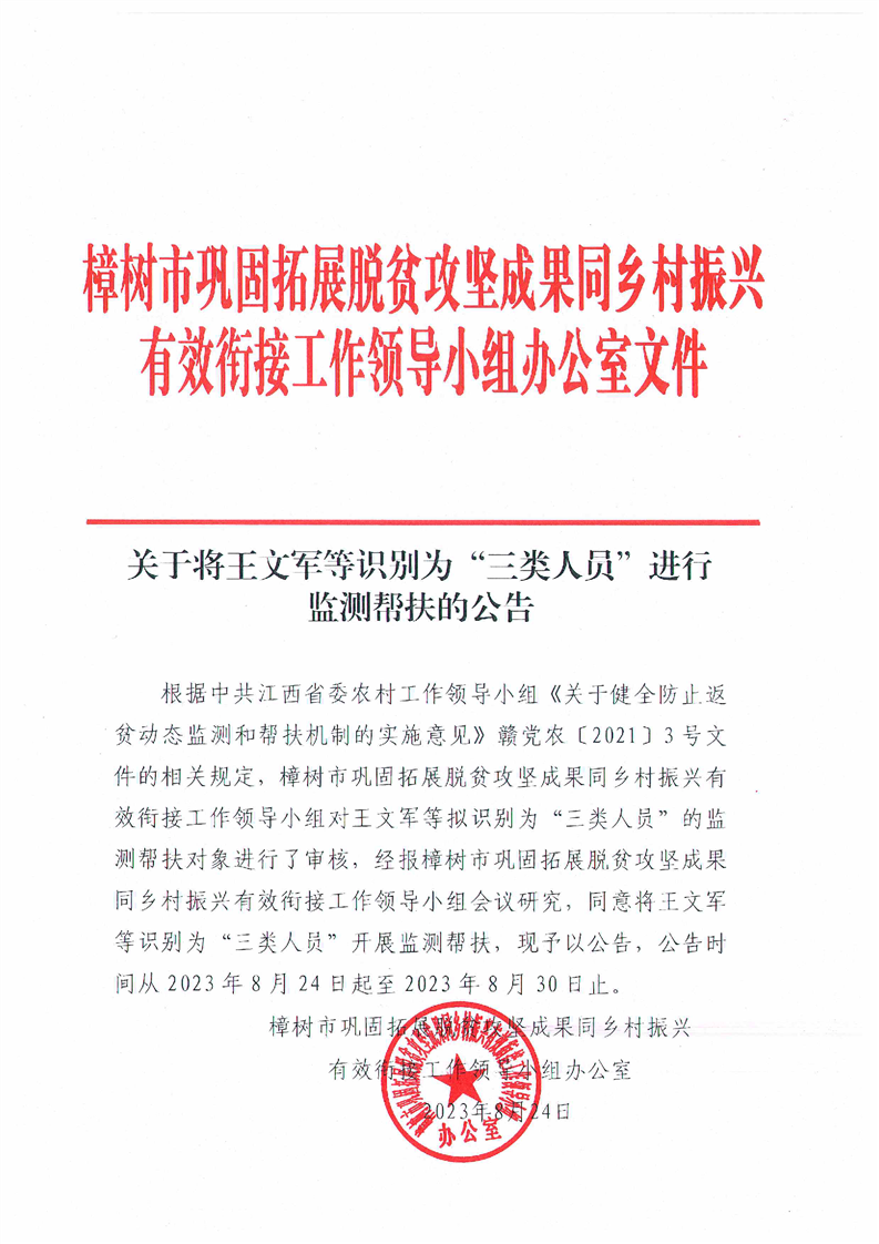 關于將王文軍等識別為“三類人員”進行監測幫扶的公告