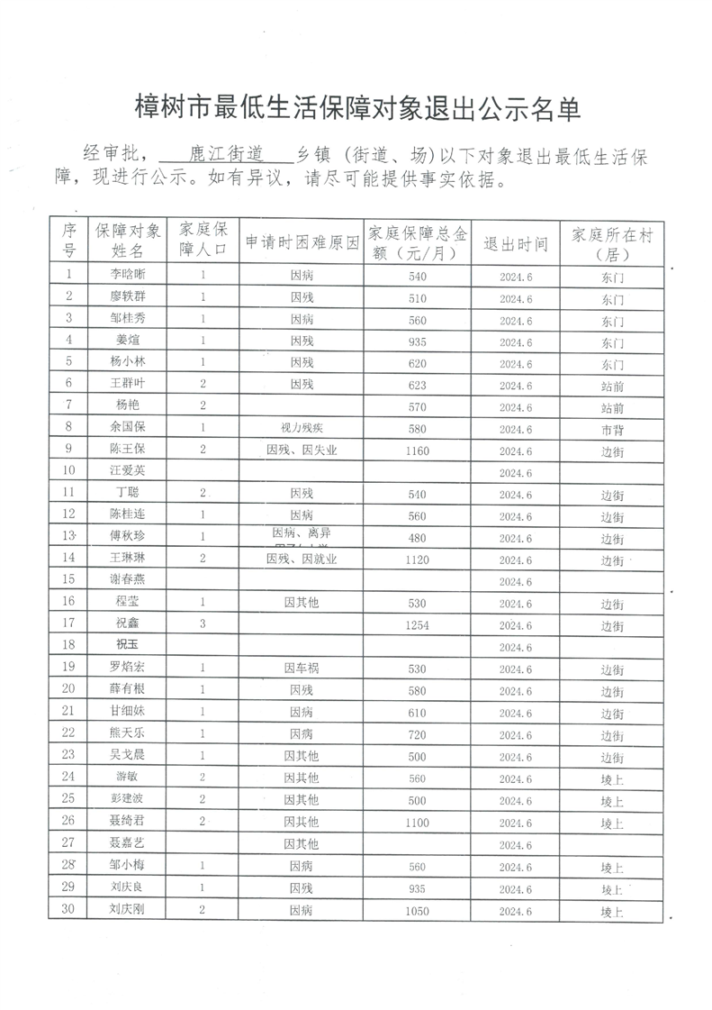 樟樹市鹿江街道最低生活保障對象退出公示名單
