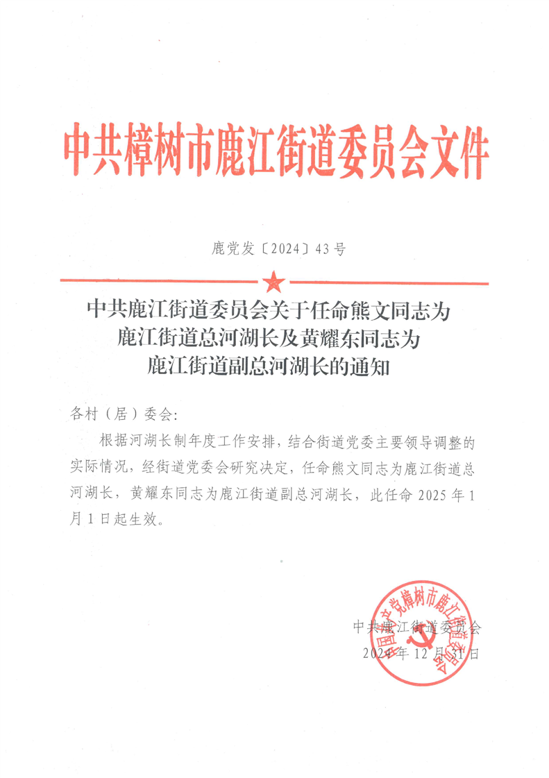 關(guān)于任命熊文同志為鹿江街道總河湖長及黃耀東同志為鹿江街道副總河湖長的通知
