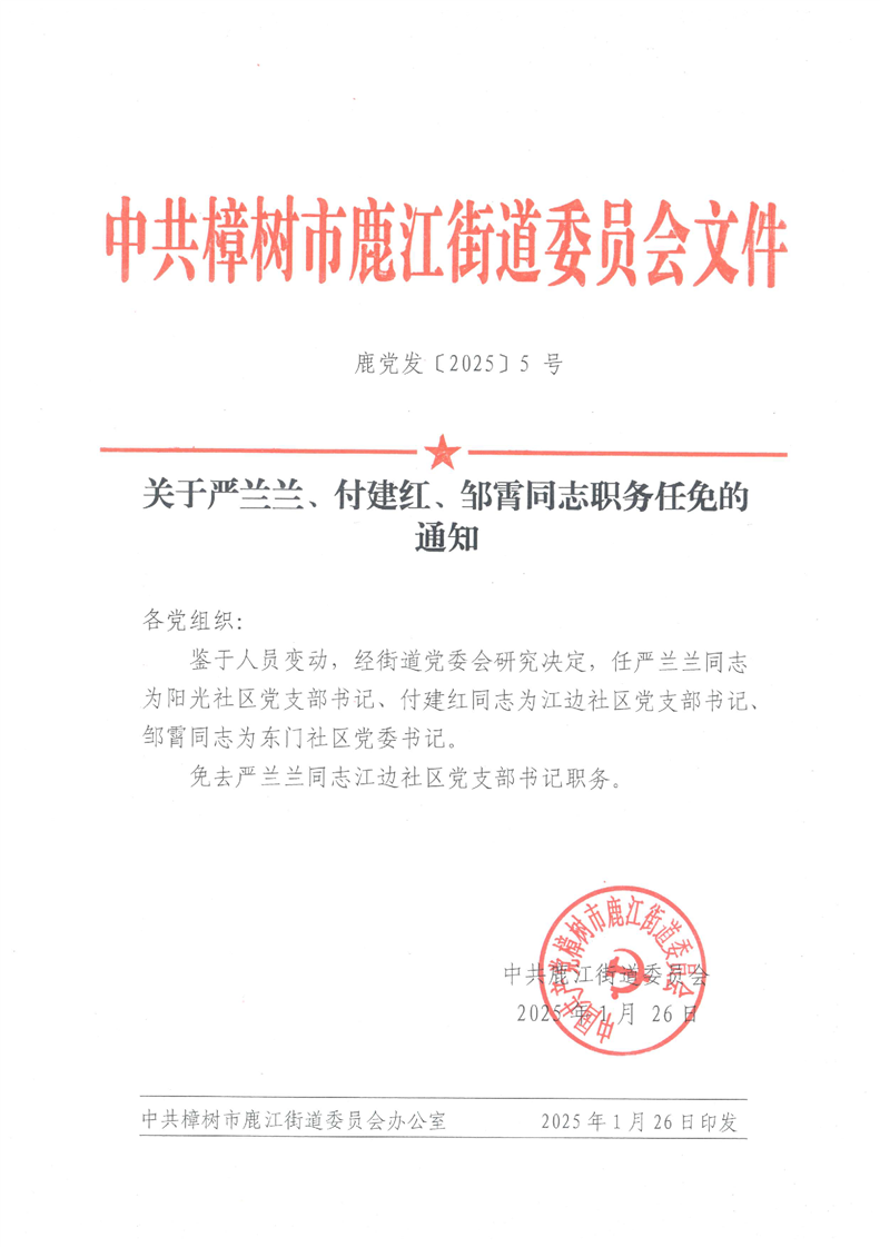 關于嚴蘭蘭、付建紅、鄒霄同志職務任免的通知