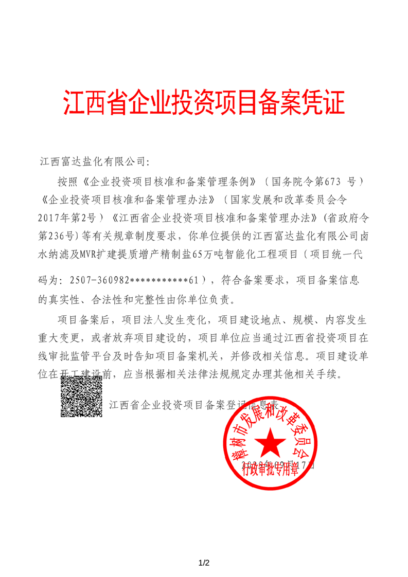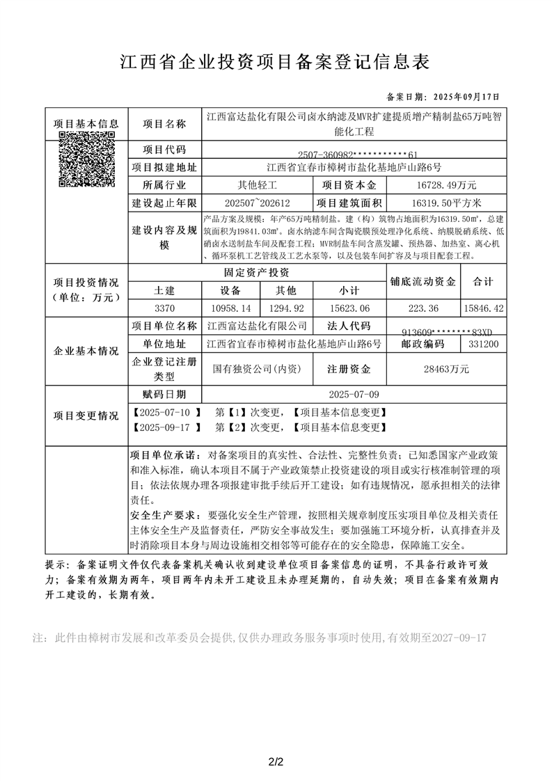 江西富達鹽化有限公司鹵水納濾及MVR擴建提質增產精制鹽65萬噸智能化工程備案