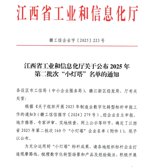 近日,江西省工業(yè)和信息化廳公布了2025年制造業(yè)第二批數(shù)字化轉(zhuǎn)型標(biāo)桿企業(yè)名單,樟樹(shù)市數(shù)字化轉(zhuǎn)型成果豐碩,1家企業(yè)斬獲“數(shù)智工廠”,6家企業(yè)獲評(píng)“小燈塔”,成為全市智能制造領(lǐng)域的新晉標(biāo)桿。