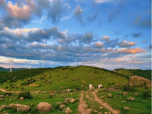 千歲丘擁有廣袤的草甸、清澈的湖泊、茂密的竹林和轉動的風車。山坳處的湖泊宛如藍寶石,倒映著天空中的風車與流云;岸邊蘆葦隨風輕擺,與綠色草地、五顏六色的帳篷相互映襯,構成了如詩如畫的美景。