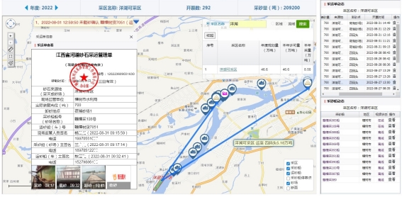 2019年10月,宜春市水利局率先在樟樹市實施電子化采運單試點。投入資金180萬,在13條采砂船、39條運砂船、4個砂場全覆蓋式安裝了監控位置感知設備、視頻監控設備,以及20套智能開票終端和物聯網數據接入砂石采運管理信息平臺。該信息平臺為包含電腦端、手機App、微信三位一體的集成系統,所有采區規劃、許可、開采等數據一圖通查,采砂船(車)、砂場等資料一目了然,在規范的基礎上實現了資料管理準確性、時效性和全面性,形成河道砂石開采、運輸、銷售的全程監控一體化 “電子采運管理單”,提升了監管效率和監管效果。該平臺于2021年2月正式運行。通過電子采運管理單的閉環管理體系的應用,實現了一碼通查,極大地提升了采砂管理和執法檢查效率,避免了砂場通行擁堵隱患,運砂車通行時間節約90%。