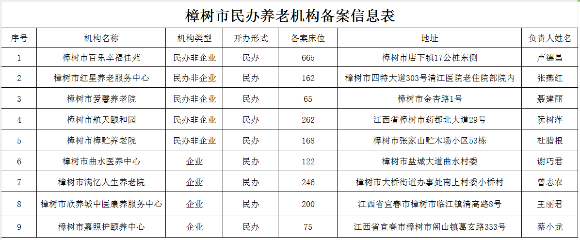 樟樹市2023年民辦養老機構備案信息表