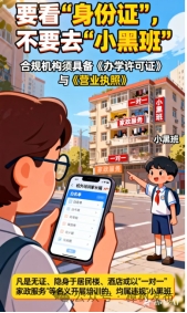 二要看“身份證”,不要去“小黑班”。合規(guī)機(jī)構(gòu)須具備《辦學(xué)許可證》與《營(yíng)業(yè)執(zhí)照》。報(bào)名前,請(qǐng)務(wù)必通過(guò)“校外培訓(xùn)家長(zhǎng)端”APP或樟樹(shù)市人民政府官網(wǎng)查詢(xún)機(jī)構(gòu)“白名單”。凡是無(wú)證、隱身于居民樓、酒店或以“一對(duì)一”“家政服務(wù)”等名義開(kāi)展培訓(xùn)的,均屬違規(guī)“小黑班”,請(qǐng)堅(jiān)決遠(yuǎn)離。