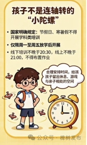 三要看內(nèi)容和時(shí)間,不要做“小陀螺”。孩子不是連軸轉(zhuǎn)的“小陀螺”。國(guó)家明確規(guī)定:節(jié)假日、寒暑假不得開(kāi)展學(xué)科類(lèi)培訓(xùn)(目前,樟樹(shù)市沒(méi)有線下學(xué)科類(lèi)培訓(xùn)機(jī)構(gòu)),僅限周一至周五放學(xué)后開(kāi)展,線下培訓(xùn)不晚于20:30,線上不晚于21:00,不得布置作業(yè)。請(qǐng)合理安排時(shí)間,給孩子留出休息、游戲與親子相處的空間。