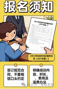 五要簽訂規(guī)范合同,不要相信口頭約定。報(bào)名前,請(qǐng)務(wù)必與機(jī)構(gòu)簽訂教育部與市場(chǎng)監(jiān)管總局制定的《中小學(xué)生校外培訓(xùn)服務(wù)合同(2021年版)》,明確培訓(xùn)內(nèi)容、時(shí)長(zhǎng)、費(fèi)用及退費(fèi)辦法。切勿輕信口頭承諾,保障自身合法權(quán)益。