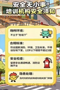 四要看場(chǎng)所環(huán)境,不要立于“危墻下”。安全無(wú)小事!培訓(xùn)機(jī)構(gòu)須符合國(guó)家消防、環(huán)保、衛(wèi)生等標(biāo)準(zhǔn):不得設(shè)在地下室,樓層不超過(guò)5層(面向12歲以下不超過(guò)3層),留意安全通道是否暢通、消防設(shè)施是否齊全。如發(fā)現(xiàn)隱患,請(qǐng)及時(shí)向機(jī)構(gòu)反映或向相關(guān)部門(mén)舉報(bào)。