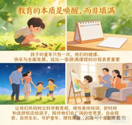讓我們共同樹(shù)立科學(xué)教育觀,理性看待培訓(xùn),把時(shí)間和選擇權(quán)還給孩子,陪伴他們?cè)趶V闊的世界里,自由探索、自然生長(zhǎng)。守護(hù)童年,理性報(bào)班,從每一個(gè)家庭做起。