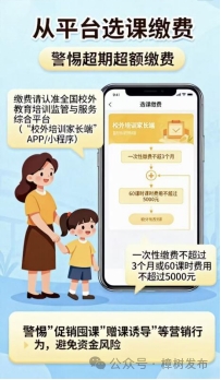 六要從平臺選課繳費,不要超期超額繳費。請認準全國校外教育培訓(xùn)監(jiān)管與服務(wù)綜合平臺(“校外培訓(xùn)家長端”APP/小程序):一次性繳費不超過3個月或60課時,費用不超過5000元。警惕“促銷囤課”“贈課誘導(dǎo)”等營銷行為,避免資金風(fēng)險。