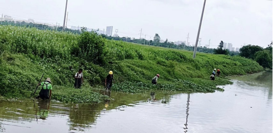 開展“清河清湖”水域專項整治行動,安排打撈人員20余人次,利用竹竿、長柄網兜等工具對轄區內河面漂浮垃圾、水草等進行人工打撈。同時,對溝塘沿岸進行清理整治,確保無固體垃圾遺留在溝沿。