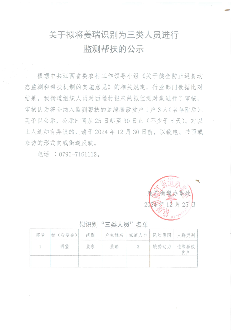 關于擬將姜瑞識別為三類人員進行監測幫扶的公示
