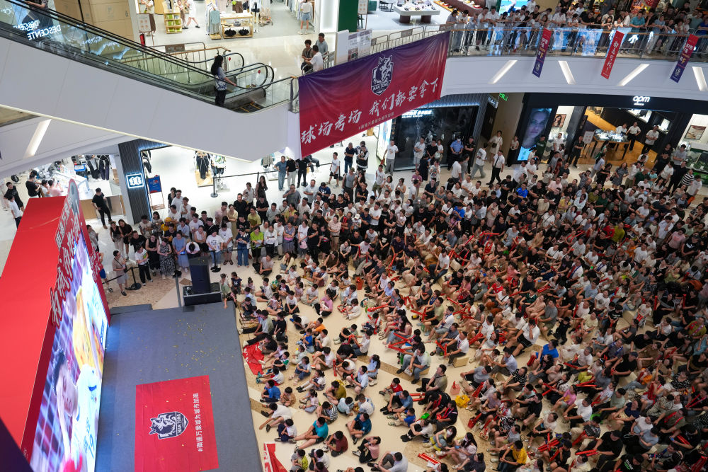 6月29日,市民、球迷在南通市內(nèi)一處商場(chǎng)觀看“蘇超”比賽直播。新華社記者 李博 攝