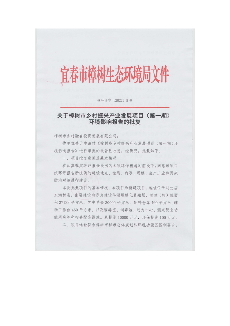 關于樟樹市鄉村振興產業發展項目(第一期)環境影響報告的批復