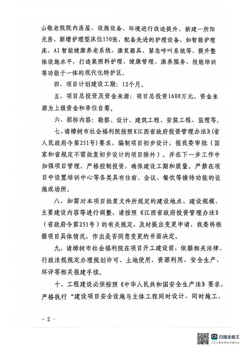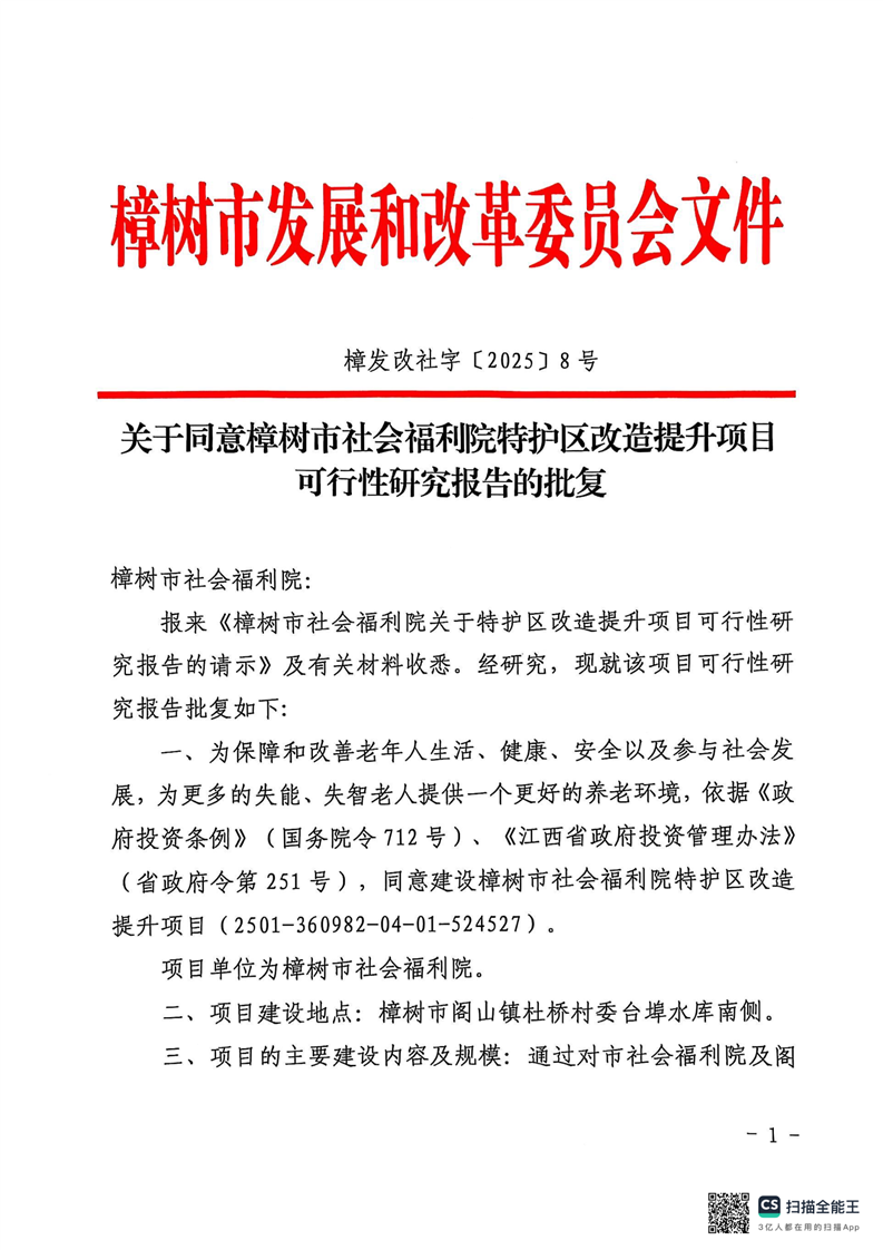 樟發(fā)改社字〔2025〕8號關(guān)于同意樟樹市社會福利院特護(hù)區(qū)改造提升項目可行性研究報告的批復(fù)