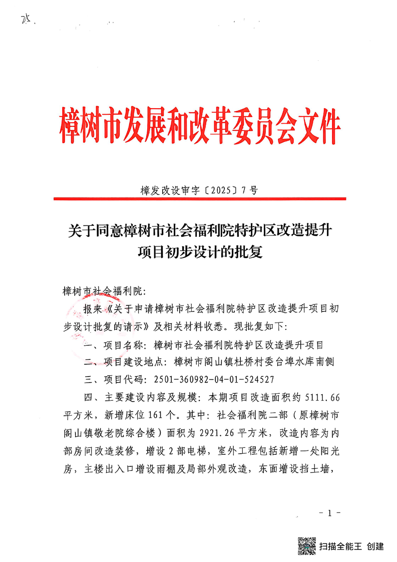 樟發改社審字〔2025〕7號關于同意樟樹市社會福利院特護區改造提升項目初步設計的批復