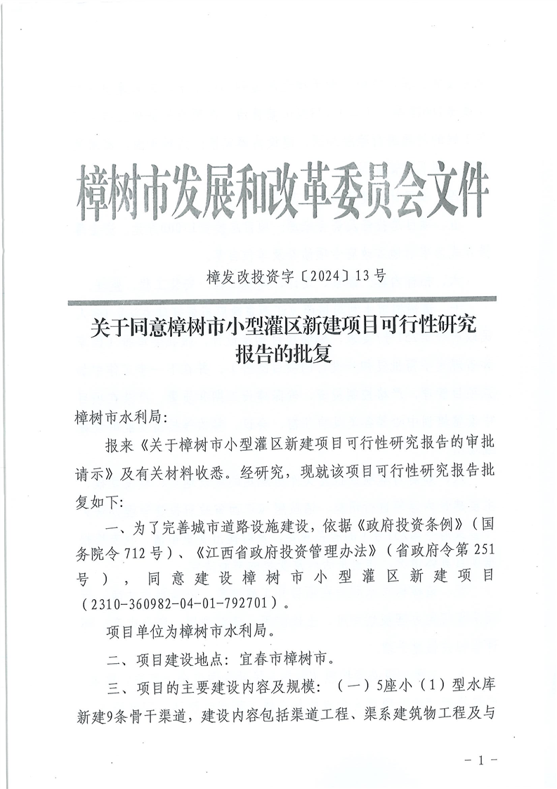 關(guān)于同意樟樹市小型灌區(qū)新建項目可行性研究報告的批復(fù)