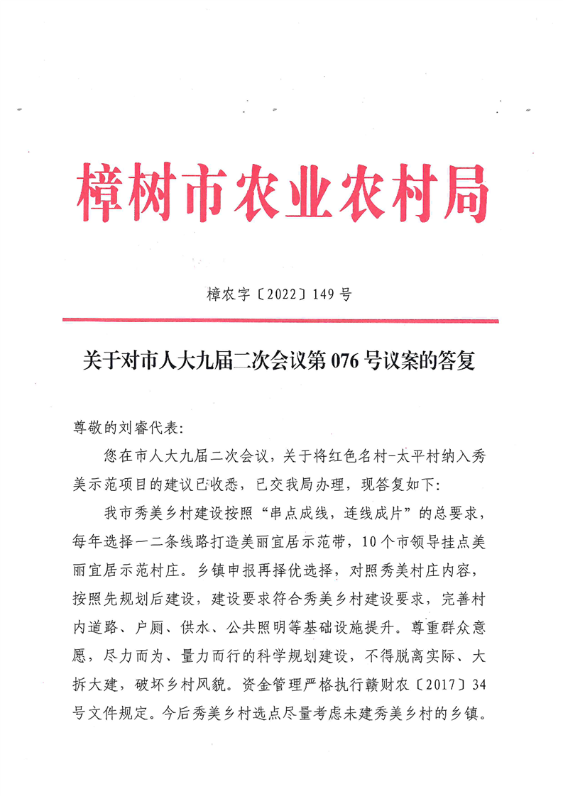 關于對市人大九屆二次會議第076號議案的答復