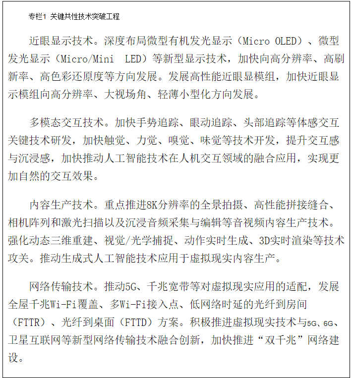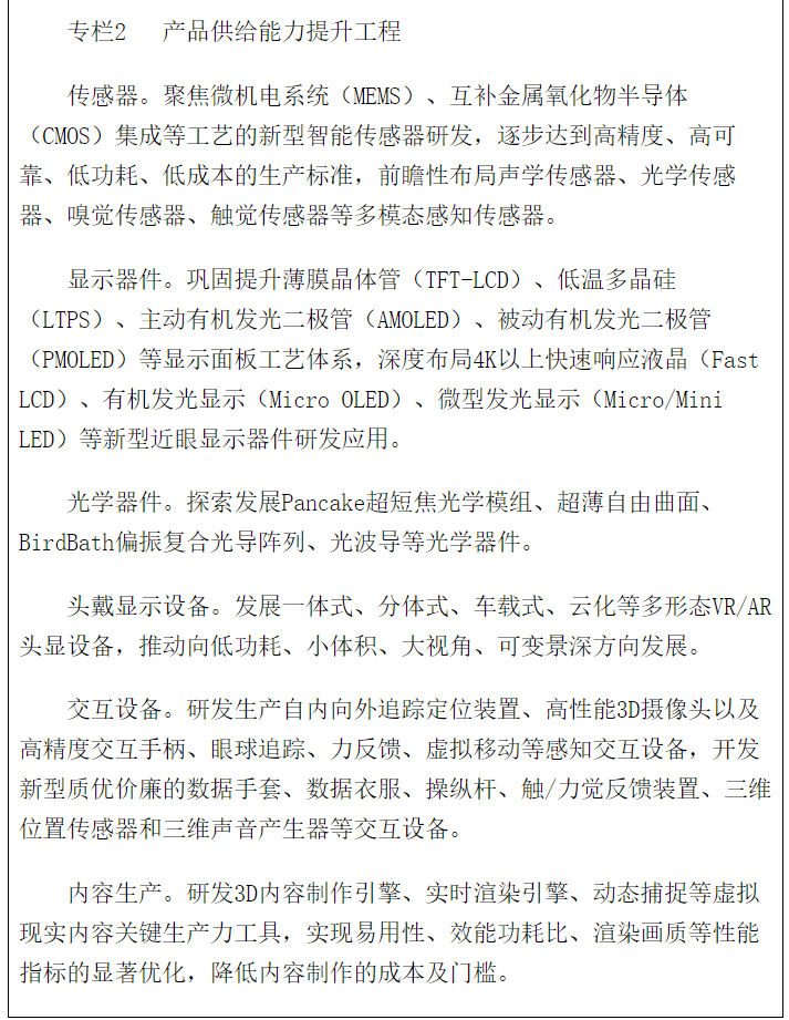 加快核心元器件、終端外設(shè)、內(nèi)容開(kāi)發(fā)工具、業(yè)務(wù)運(yùn)營(yíng)平臺(tái)的創(chuàng)新突破。鼓勵(lì)開(kāi)發(fā)先進(jìn)適用的核心元器件,發(fā)展新型智能傳感器、多模態(tài)感知傳感器、近眼顯示器件、近眼顯示模組等關(guān)鍵部件。加快終端設(shè)備創(chuàng)新突破,促進(jìn)一體式、分體式等多樣化終端產(chǎn)品發(fā)展,提升規(guī)模化量產(chǎn)能力,開(kāi)發(fā)內(nèi)容生產(chǎn)工具,提高優(yōu)質(zhì)內(nèi)容供給水平。