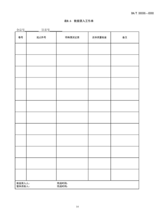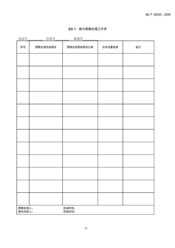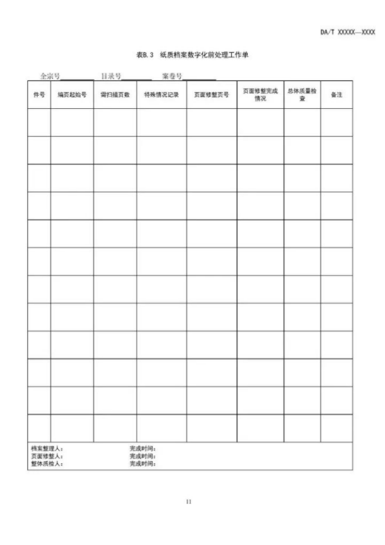 5.6.1 應根據情況制定符合實際要求的紙質檔案數字化工作文件,以此加強對數字化工作的管理。主要包括紙質檔案數字化工作方案、紙質檔案數字化審批書、紙質檔案數字化流程單、數據驗收單、項目驗收報告、紙質檔案數字化成果移交清單等,采取外包方式實施時,還應包括項目招標文件、投標文件、中標通知書、項目合同、保密協議等。部分工作單示例參見附錄B。