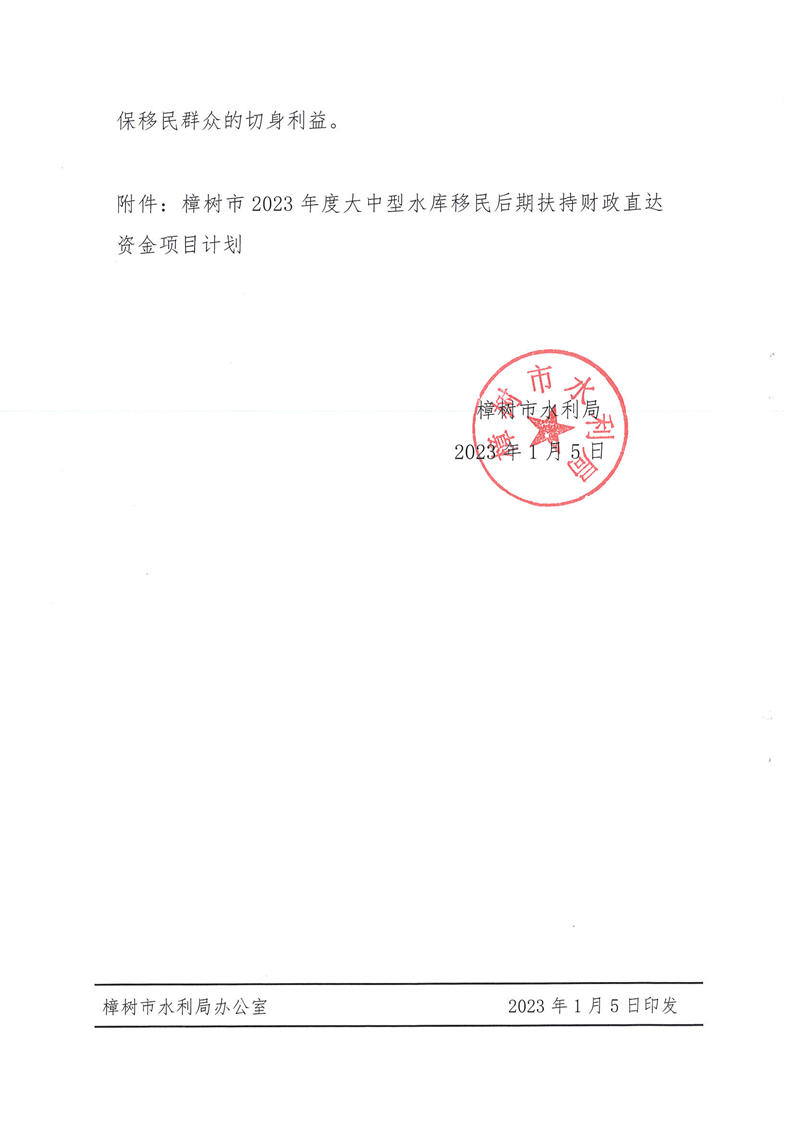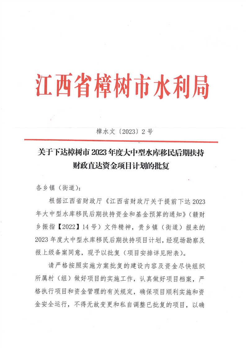 樟水文〔2023〕2號關(guān)于下達2023年水庫移民財政直達資金項目計劃的批復(fù)