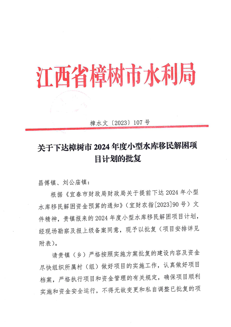 關于下達樟樹市2024年度小型水庫移民解困項目計劃的批復