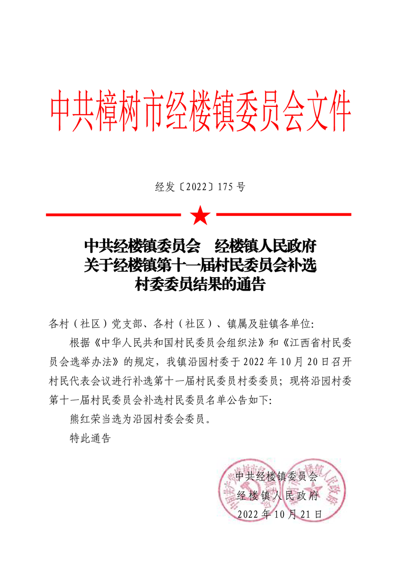 經發﹝2022﹞175號關于經樓鎮第十一屆村民委員會補選村委委員結果的通告