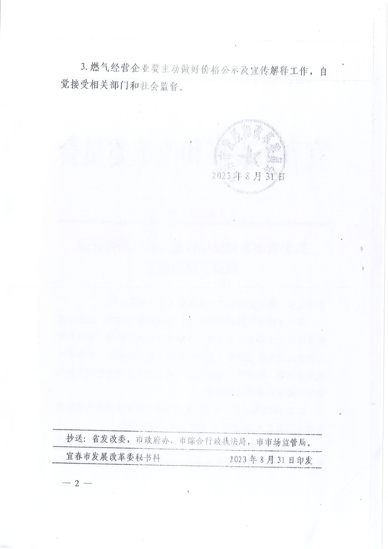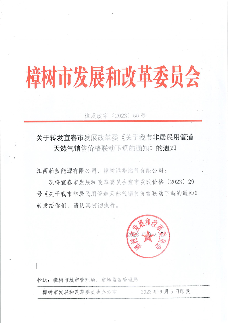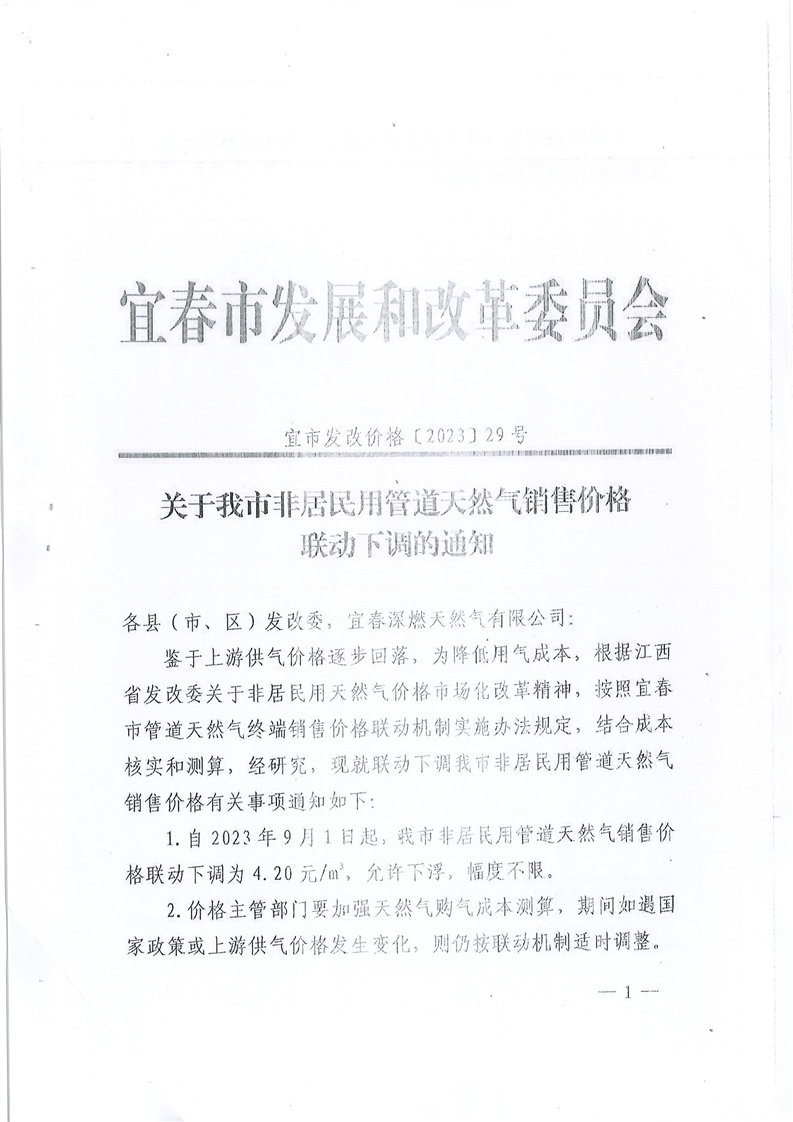 關于轉發宜春市發展改革委《關于我市非居民用管道天然氣銷售價格聯動下調的通知》的通知